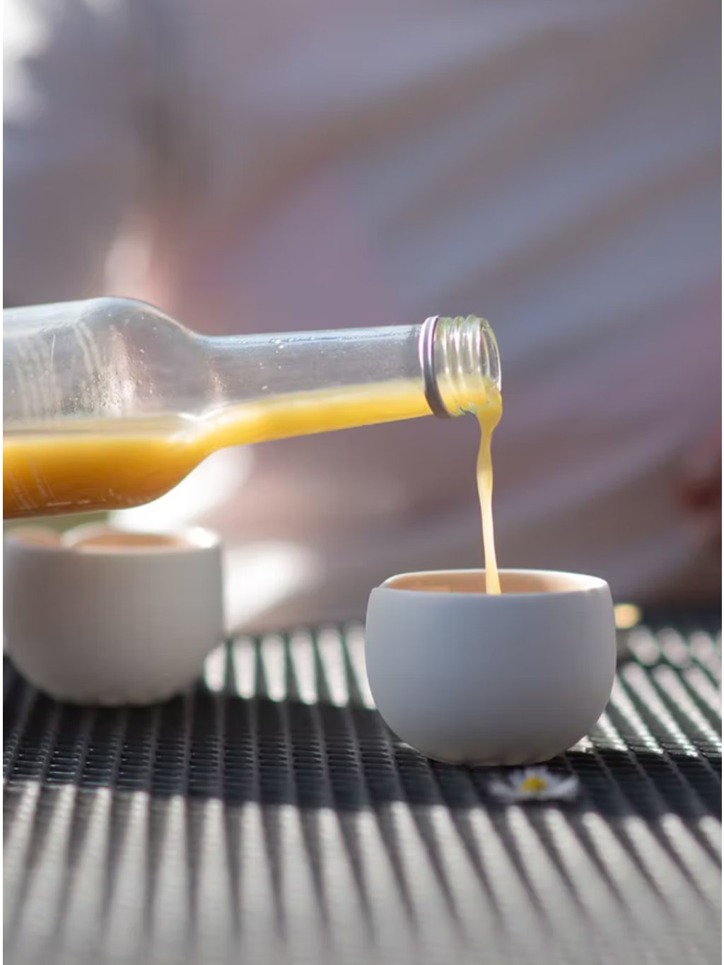 Výroba Ginger Shotů se vyznačuje pečlivým řemeslným zpracováním a důrazem na kvalitu surovin. Používá se výhradně bio zázvor, který je zpracováván i se slupkami, aby si zachoval maximum prospěšných látek. Každý krok výroby – od důkladného čištění lahví a surovin, přes drcení a lisování zázvoru, až po míchání s ovocnými složkami – je navržen tak, aby zajistil dokonalou chuť a maximální účinnost. Výsledkem je koncentrovaný, přírodní Ginger Shot bez kompromisů, který nabízí čistou sílu zázvoru v každé lahvičce.